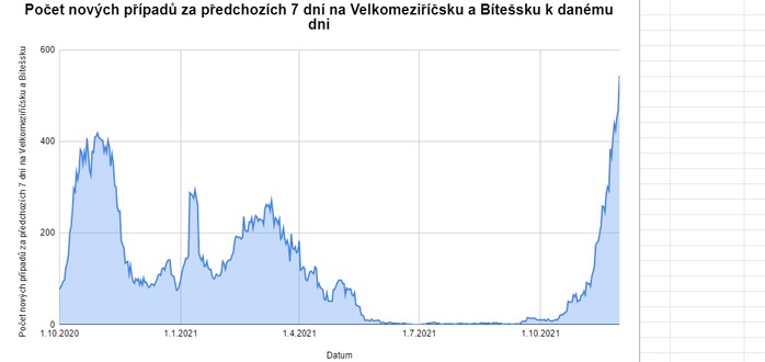Následující graf shrnuje počet nových případů za posledních 7 dní na Velkomeziříčsku a Velkobítešsku od počátku března 2020, kdy se začala tato data počítat, do 30. listopadu 2021. Data vycházejí z otevřených datových sad Ministerstva zdravotnictví České republiky.