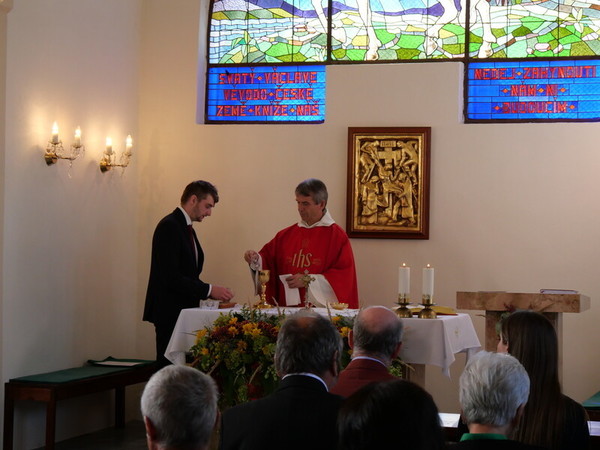 V Hrbově mši svatou před zaplněnou kaplí sv. Václava a sv. Izidora sloužil hodinu před polednem velkomeziříčský děkan P. Jiří Kaňa.